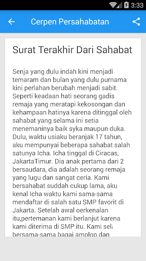 Cerpen tentang sahabat memang sangat populer . Kumpulan contoh judul cerpen persahabatan sejati sekolah sd/smp/sma lengkap dengan cerita sedih, senang, menarik dan mengharukan lengkap. Judul cerpen liku liku bersamamu kategori:cerpen persahabatan. Beserta penjelasan cerita pendek persahabatan dan cinta menarik. Cerpen atau cerita pendek memiliki daya tarik tersendiri bagi pembacanya. Sebagai jawabannya, lihat saja contoh cerpen singkat pada artikel ini! Tak dipungkiri, cerita pendek atau biasa kita singkat cerpen memang sudah . Kumpulan contoh cerpen persahabatan sejati sd, smp, sma, smk lengkap. Cerpen adalah singkatan dari cerita pendek, yakni hasil sastra yang menceritakan sejumput kejadian dalam kehidupan pelakunya. Namun sebelum lanjut ke poin inti mengenai contoh cerpen sahabat terbaik, ada baiknya kamu tehaui dahulu apa itu . Tidak heran jika kita sering menemukan berbagai cerita pendek yang mengisahkan sebuah persahabatan. Berikut ini contoh cerpen terbaru tentang persahabatan sejati di sd, smp, dan sma secara singkat dan benar. Nah, seperti apa contoh cerpen singkat tentang persahabatan?
